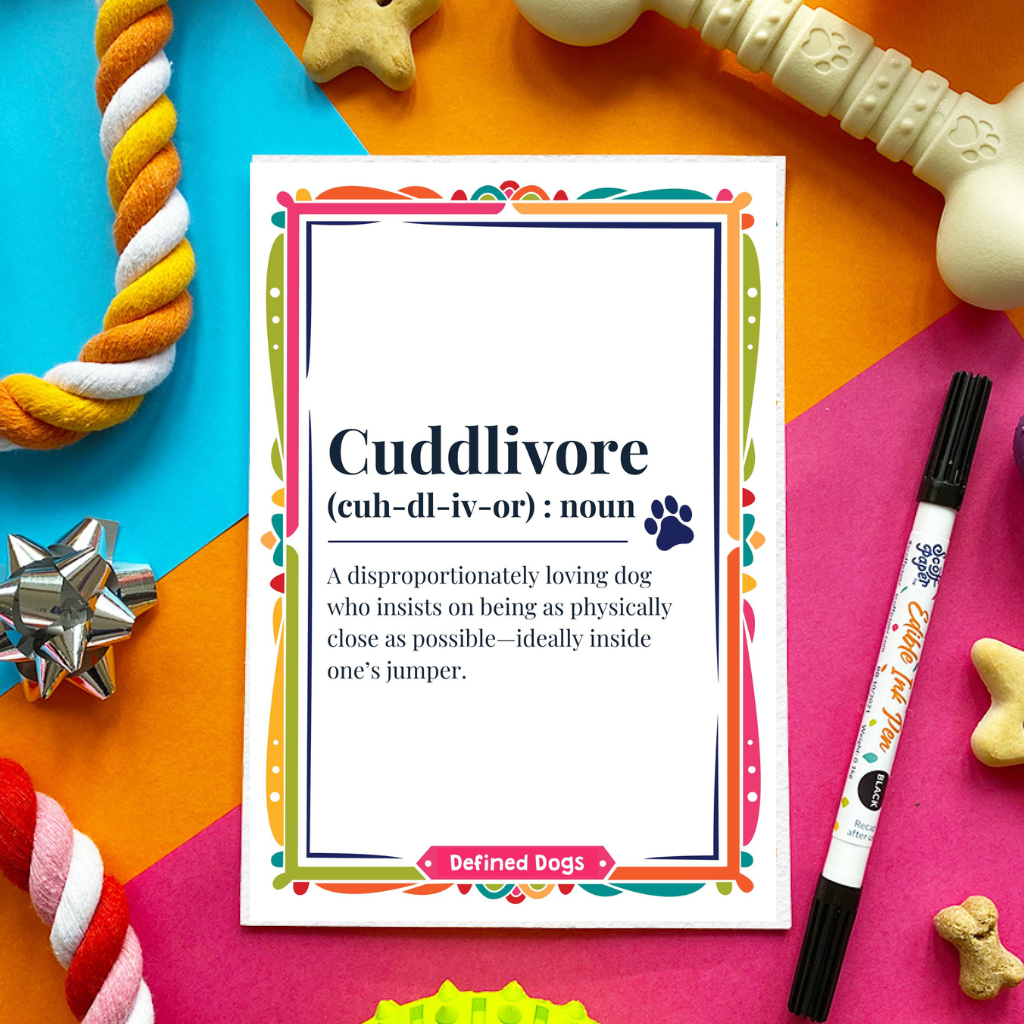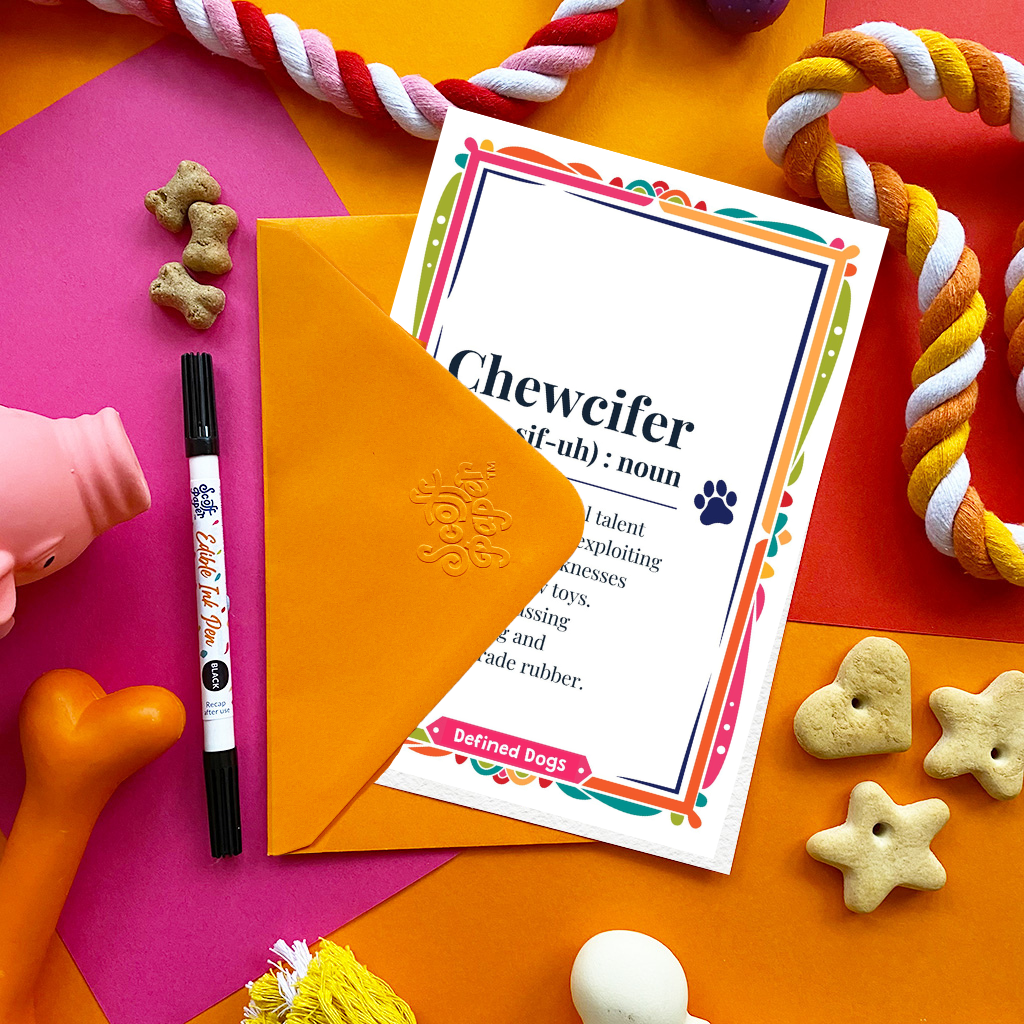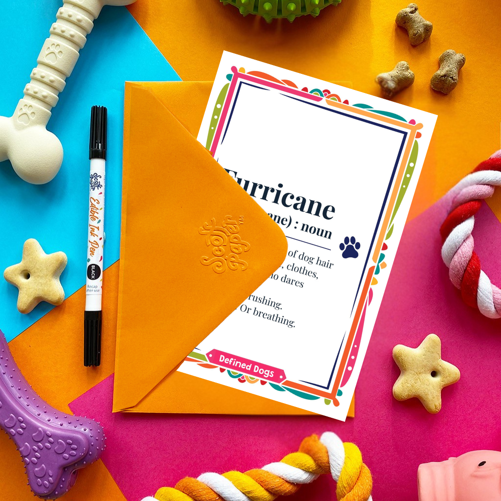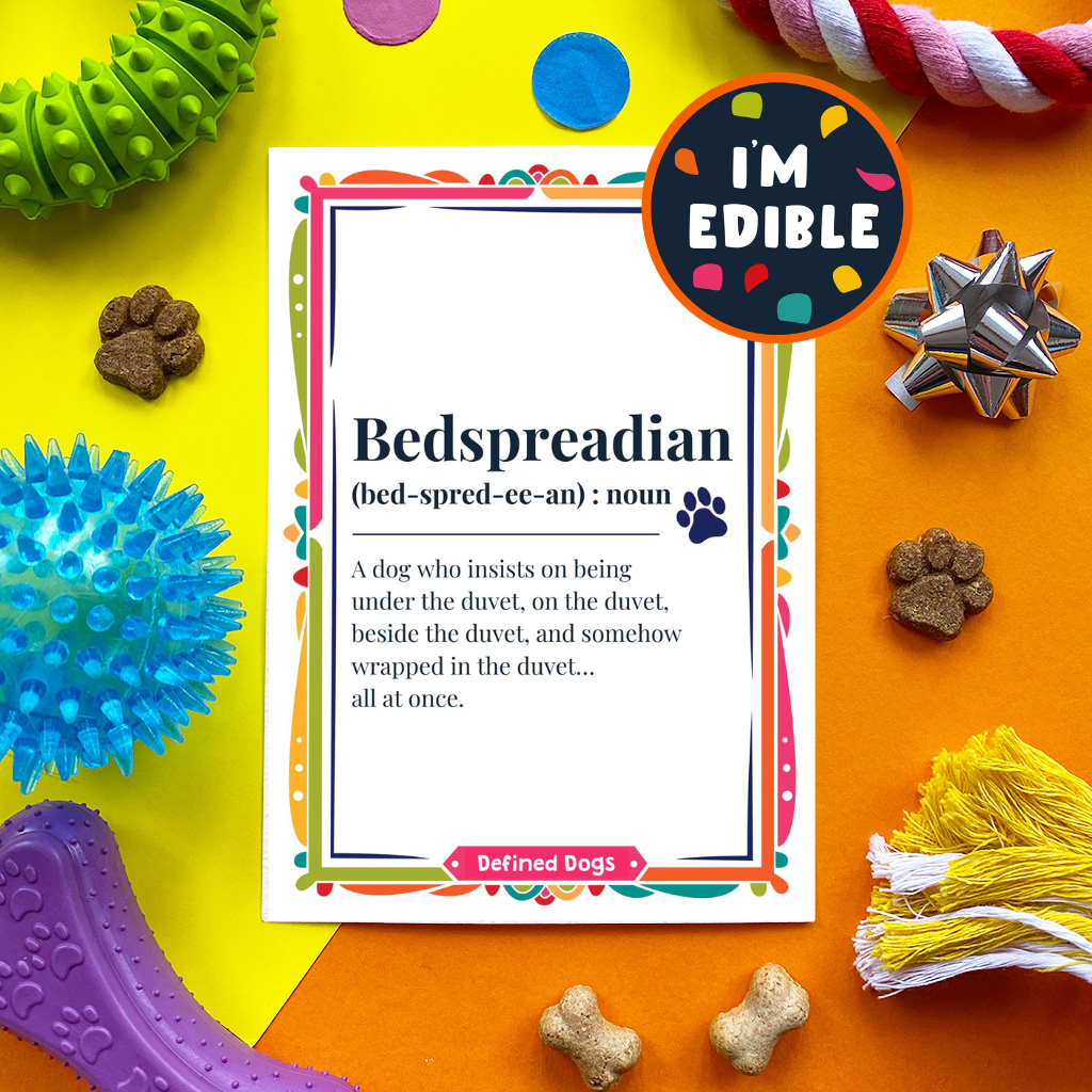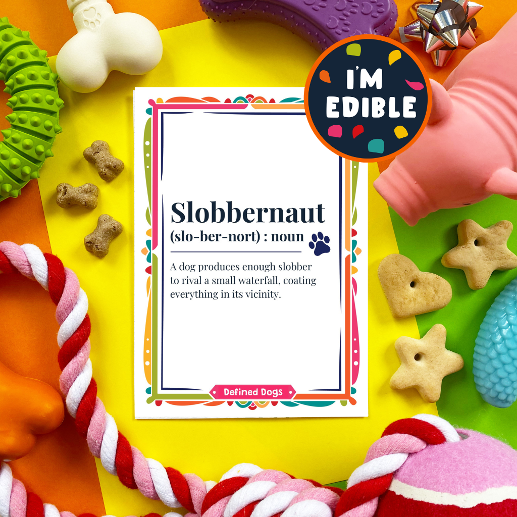 The Defined Dogs collection celebrates the wonderfully chaotic personalities that make living with dogs so entertaining. Each edible dog card features a humorous dictionary-style definition describing a type of dog we all recognise — from cuddle addicts to professional snack thieves.