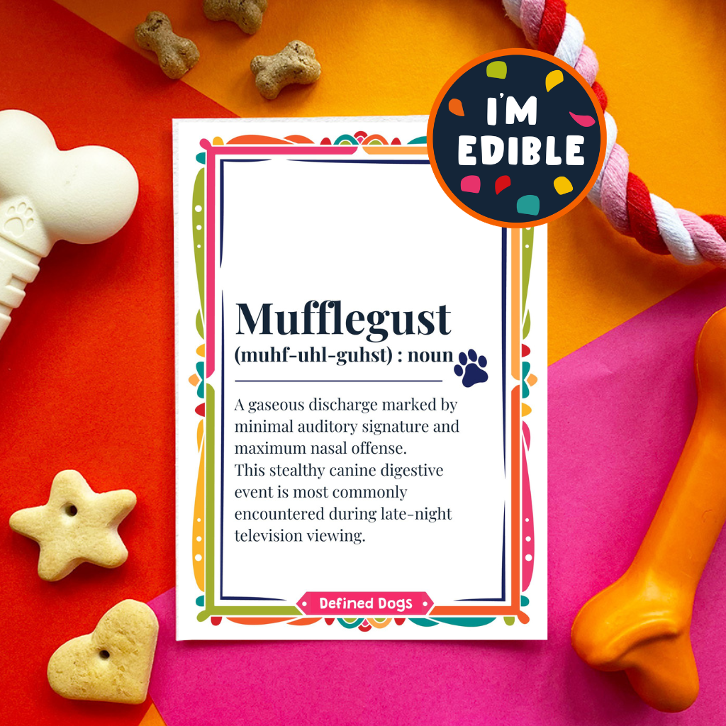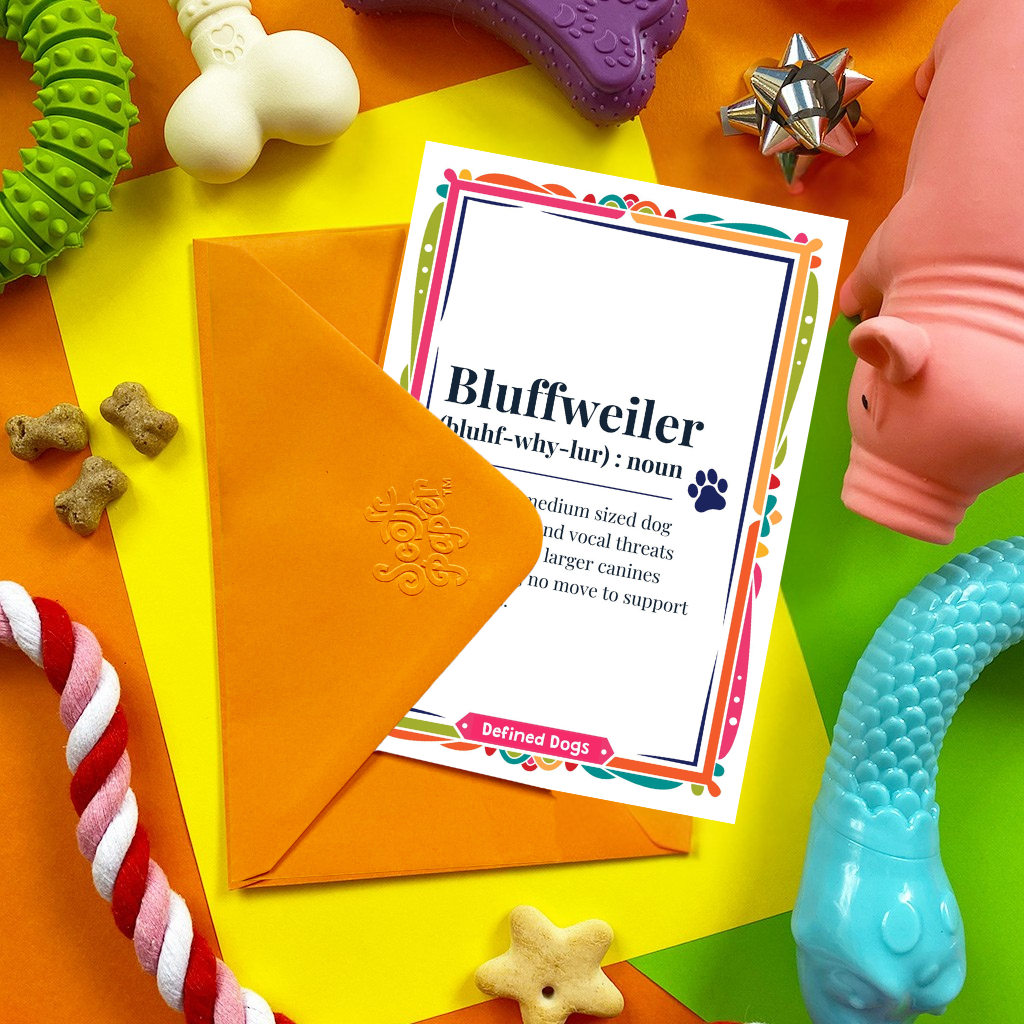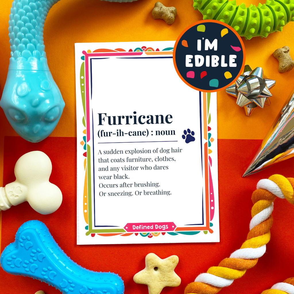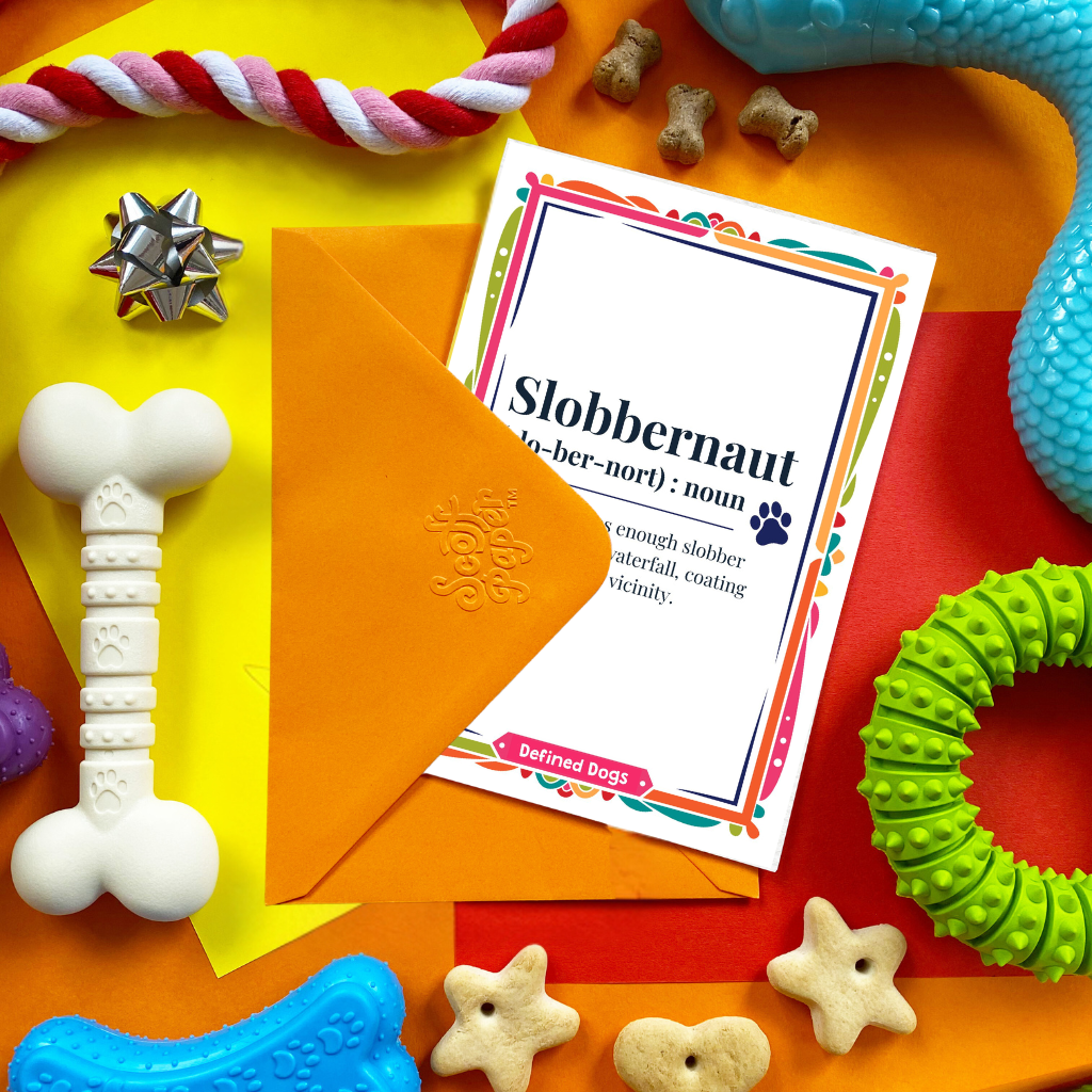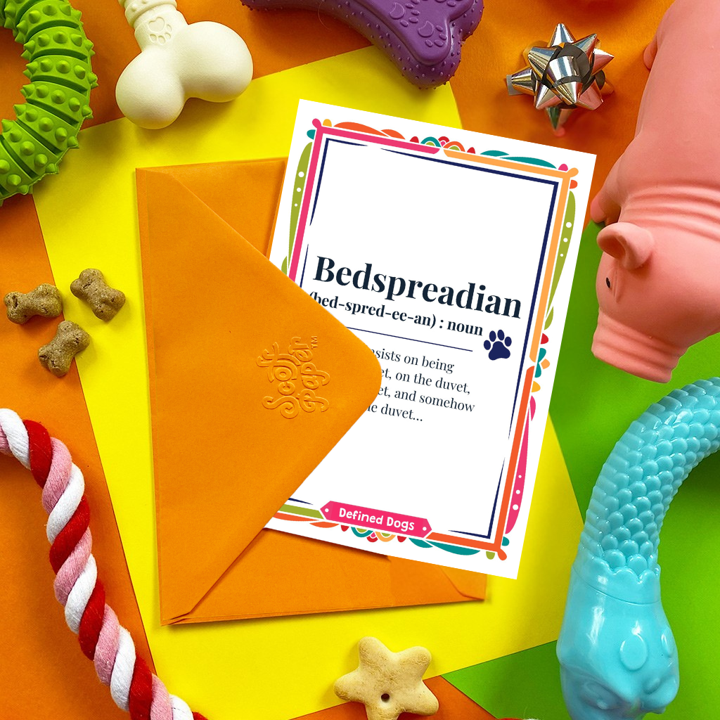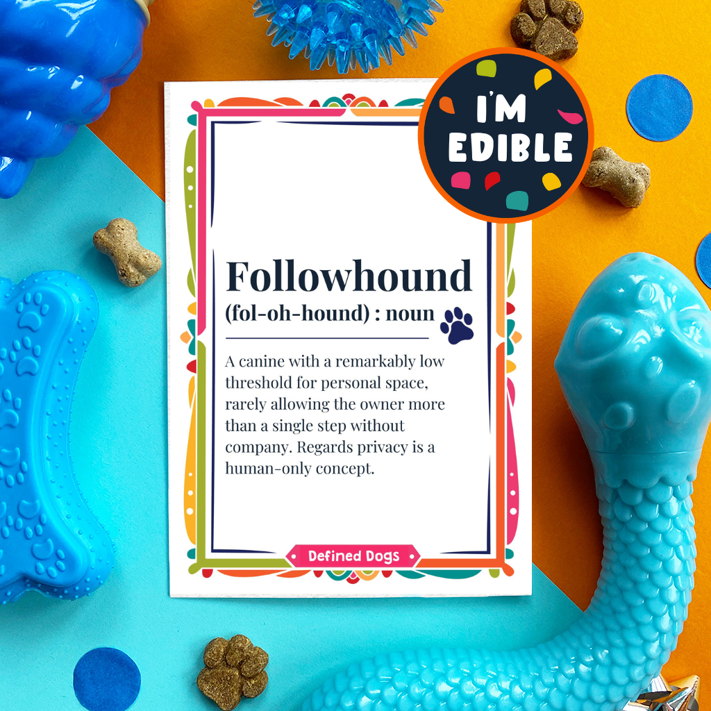 The Defined Dogs collection celebrates the wonderfully chaotic personalities that make living with dogs so entertaining. Each edible dog card features a humorous dictionary-style definition describing a type of dog we all recognise — from cuddle addicts to professional snack thieves.