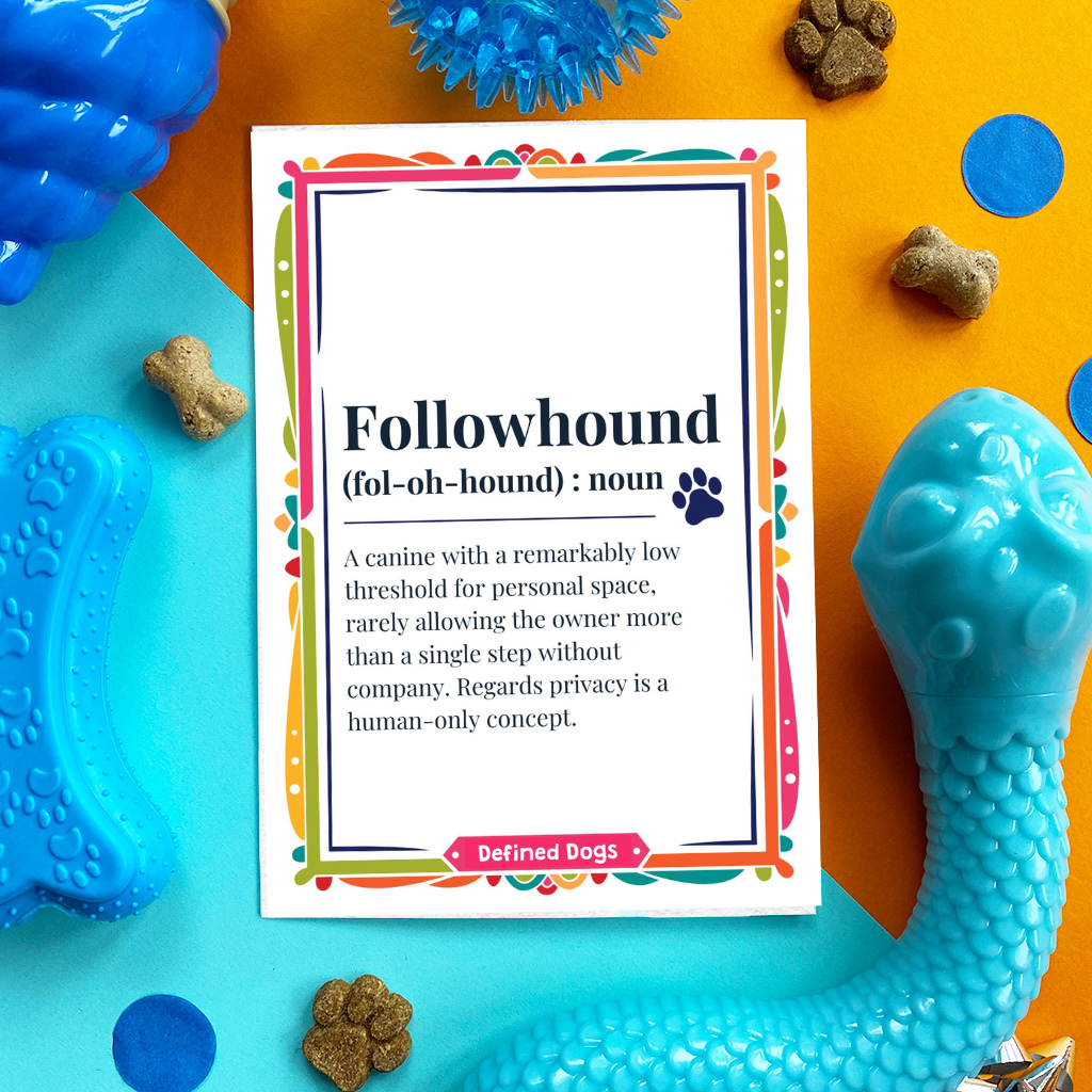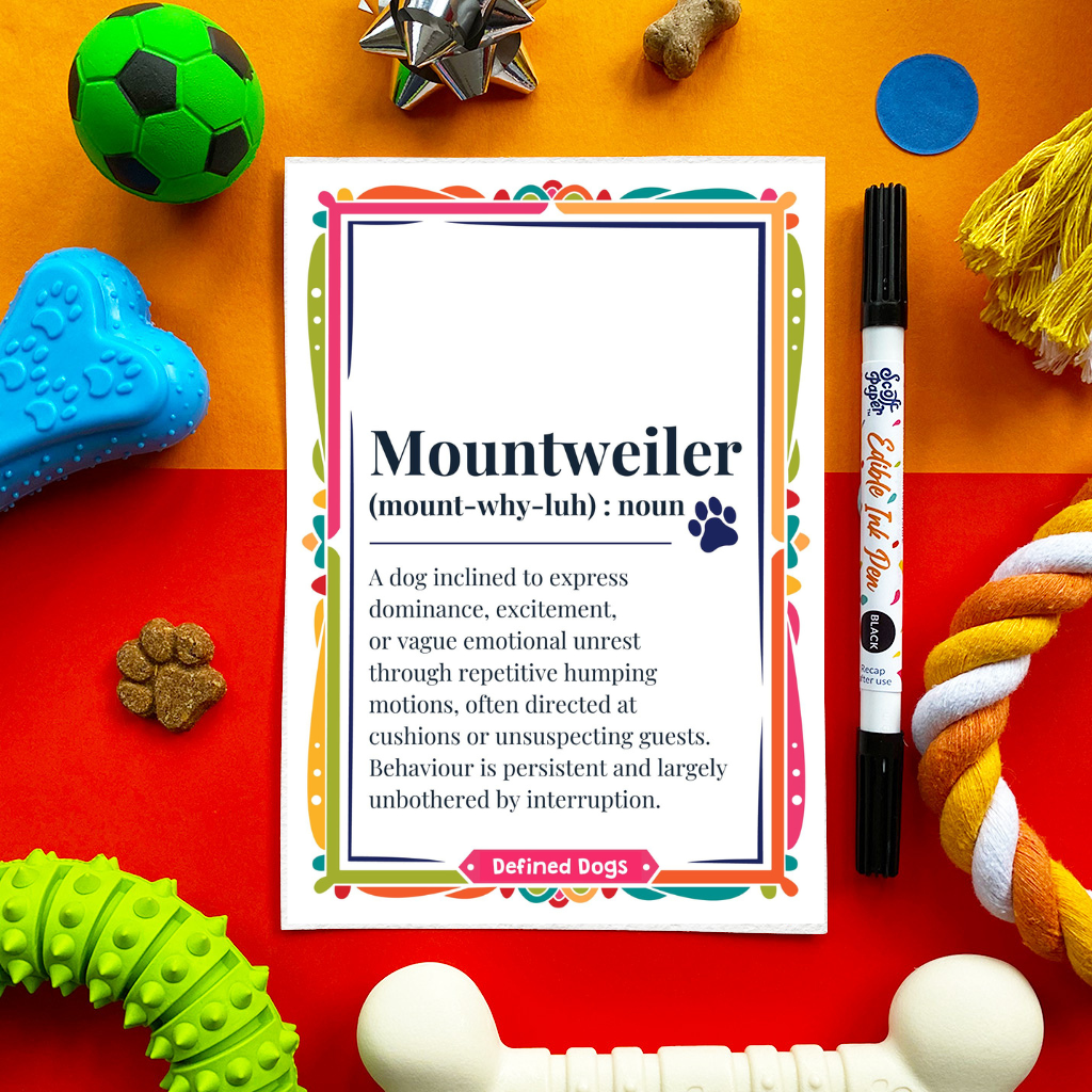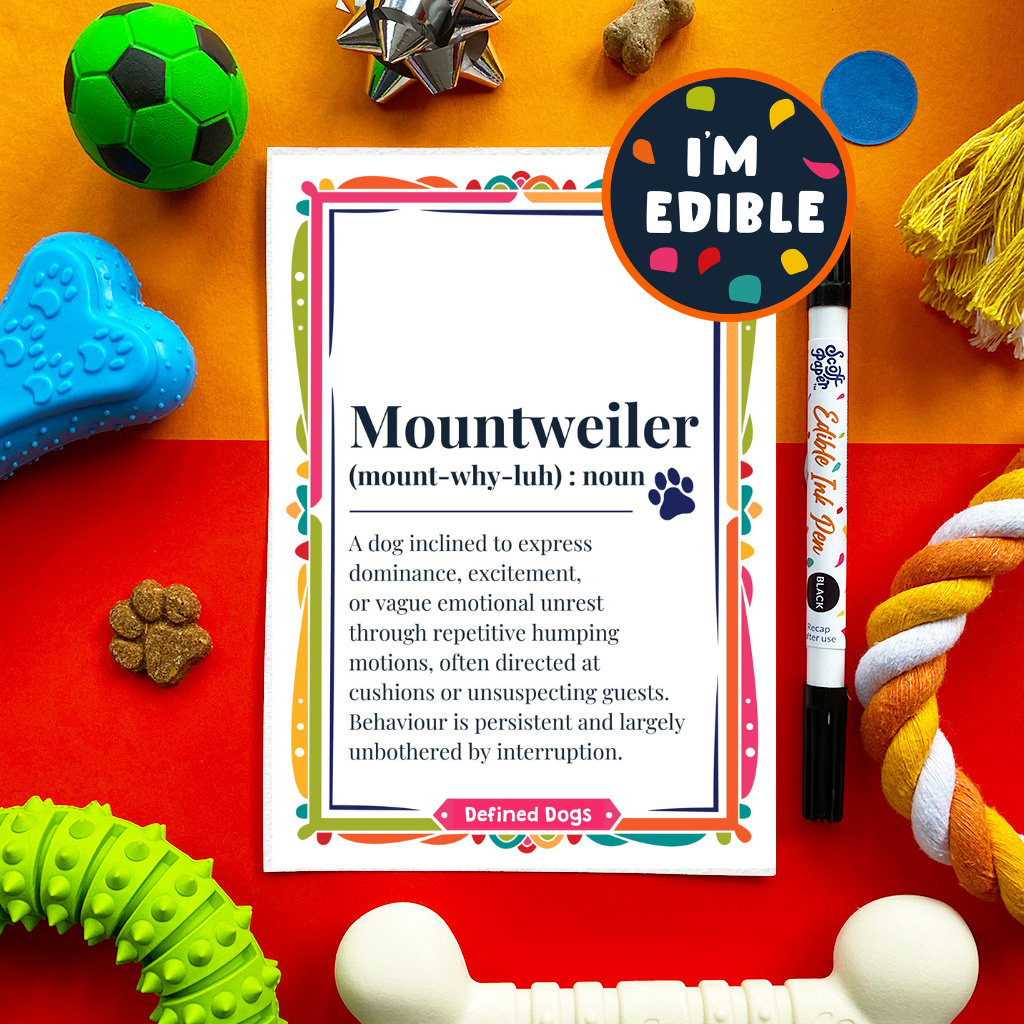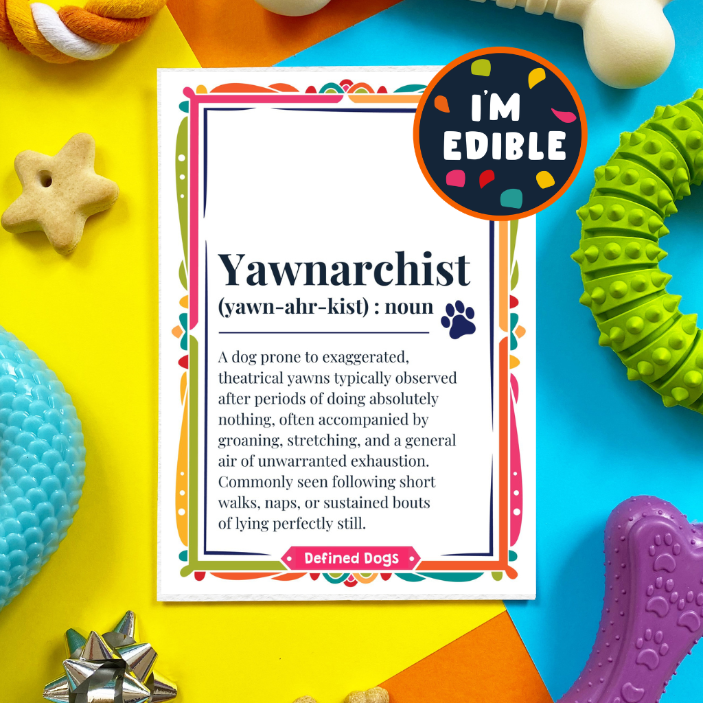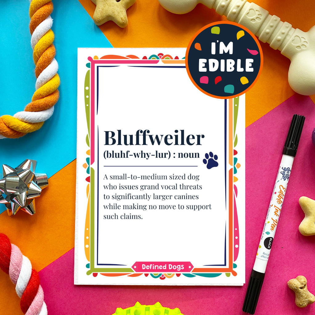 The Defined Dogs collection celebrates the wonderfully chaotic personalities that make living with dogs so entertaining. Each edible dog card features a humorous dictionary-style definition describing a type of dog we all recognise — from cuddle addicts to professional snack thieves.